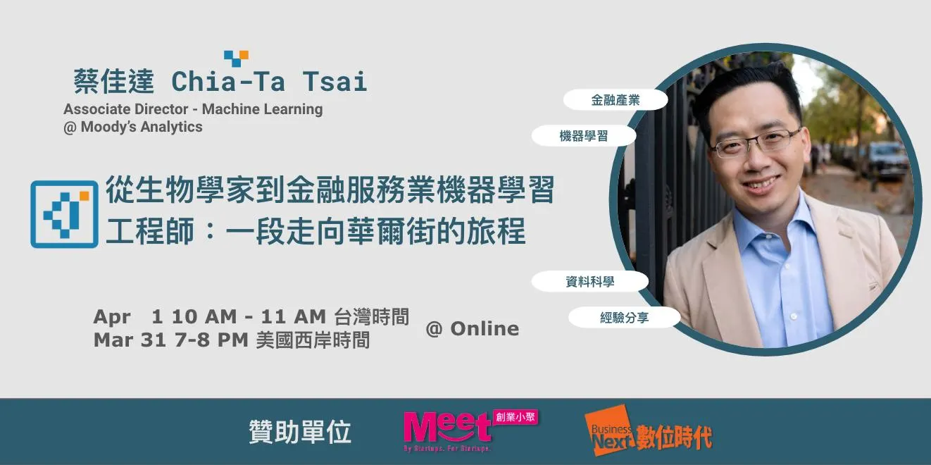 Chia-Ta Tsai 目前在Moody’s服務接近兩年的時間。目前在旗下的穆迪分析(Moody’s Analytics)的機器學習工程副總監(Associate Director — Machine Learning Engineer) ,迄今旅美在業界有4年多的工作經驗,專案參與內容橫跨機器學習、資料科學、軟體工程,在進入業界工作之前主修生物科技,並曾取得計算生物學博士候選人資格。
